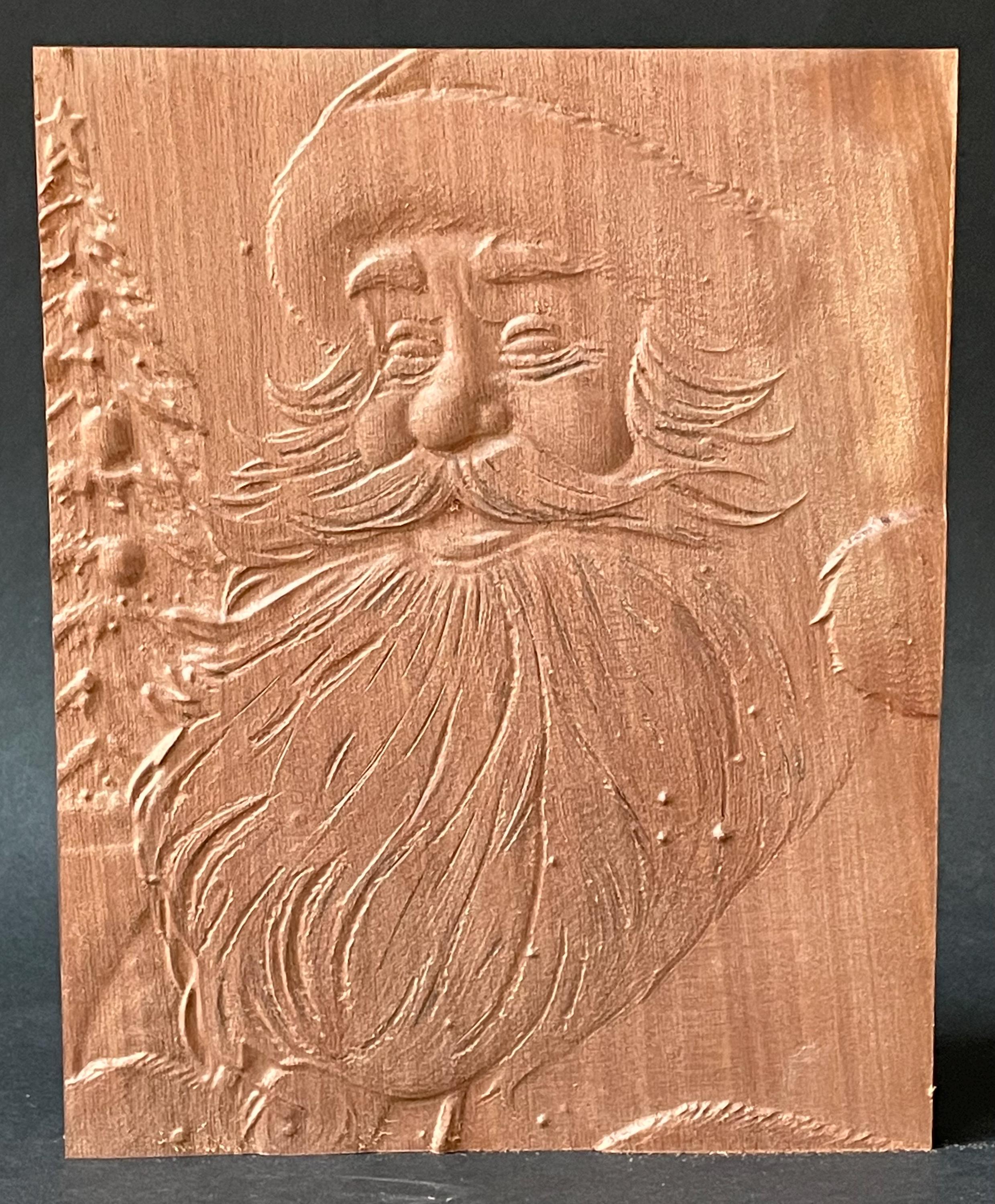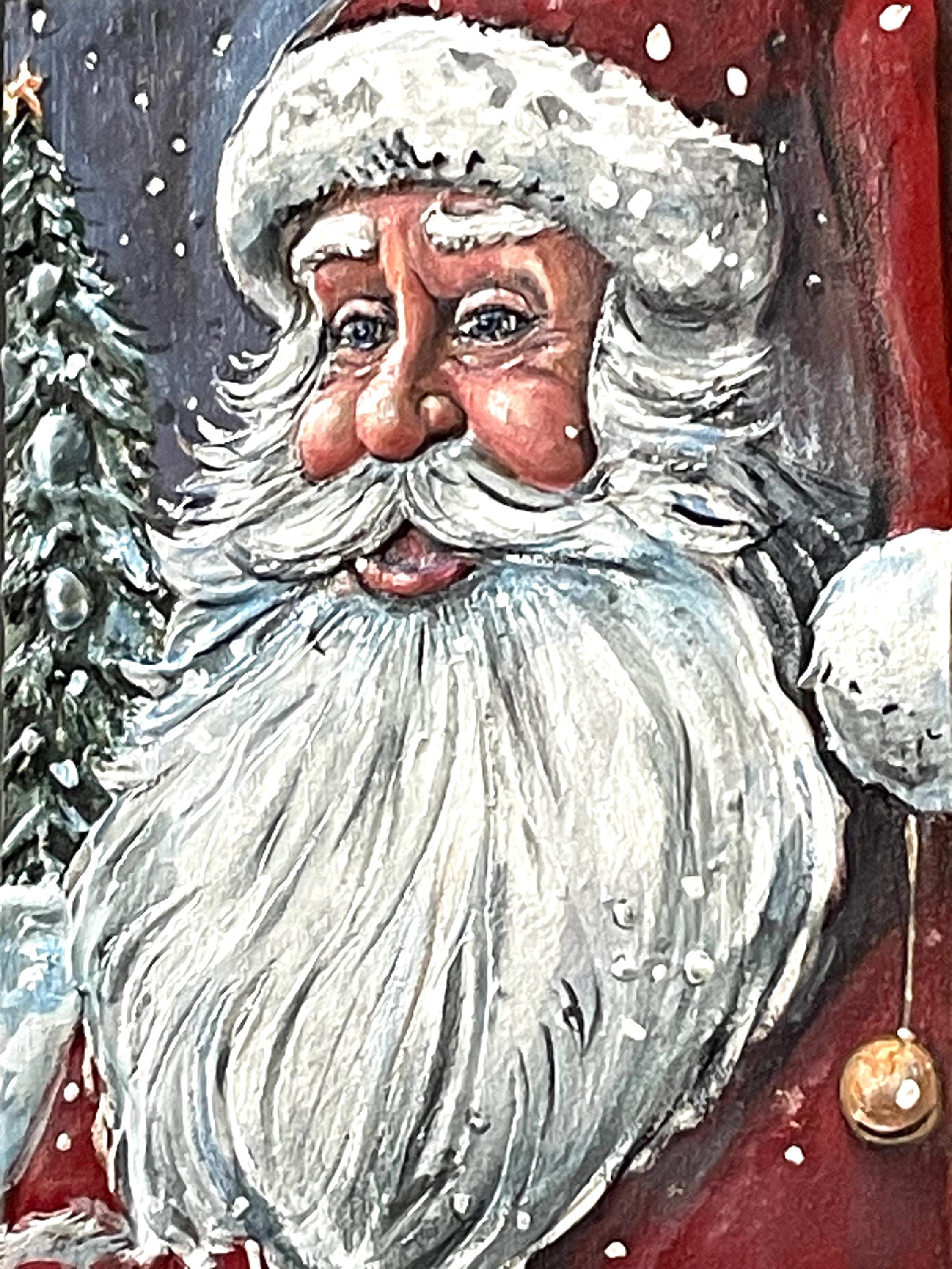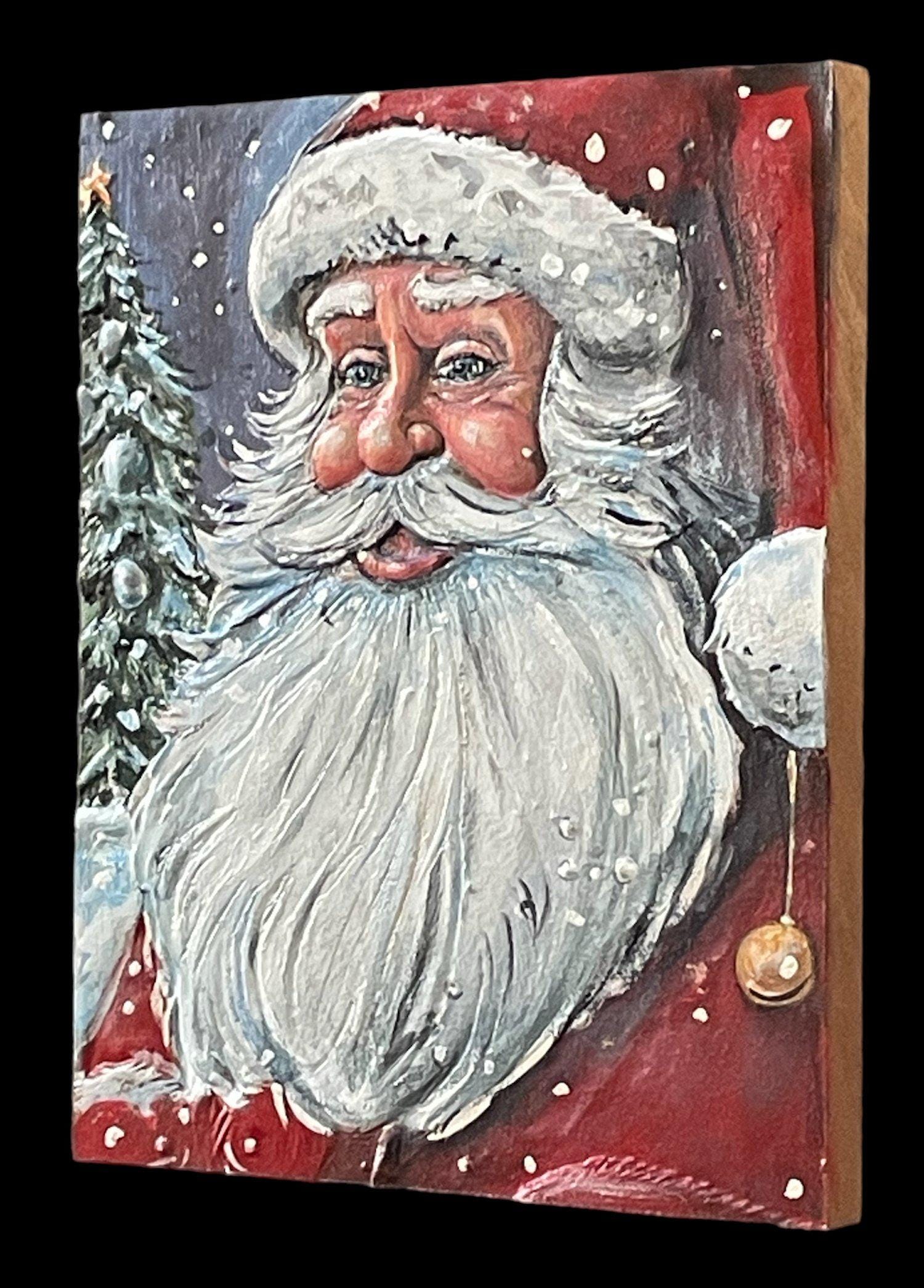 Wood Carved Santa with a wintery background. Hand painted. Carved in cherry. Wood finish applied. Ready to hang.