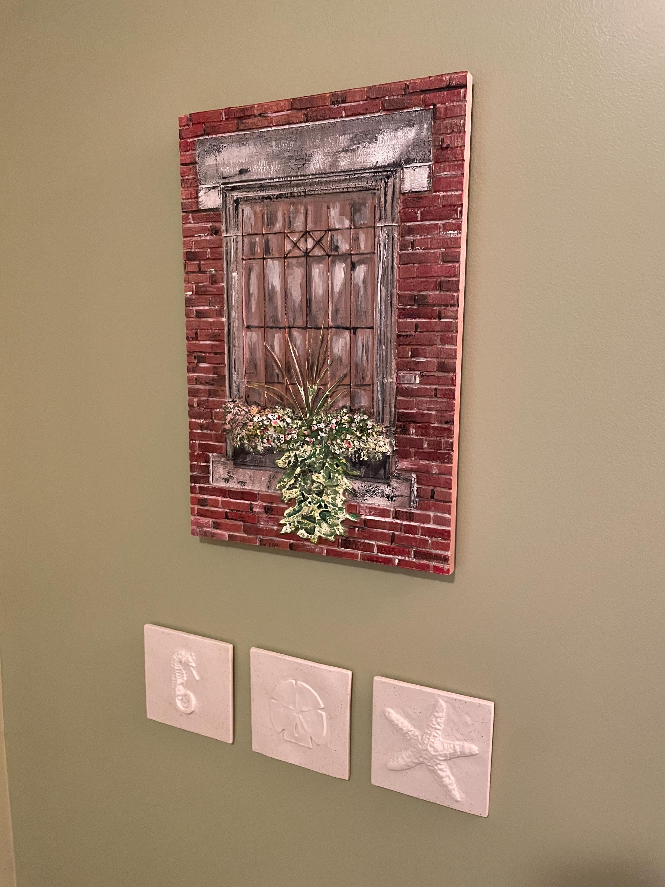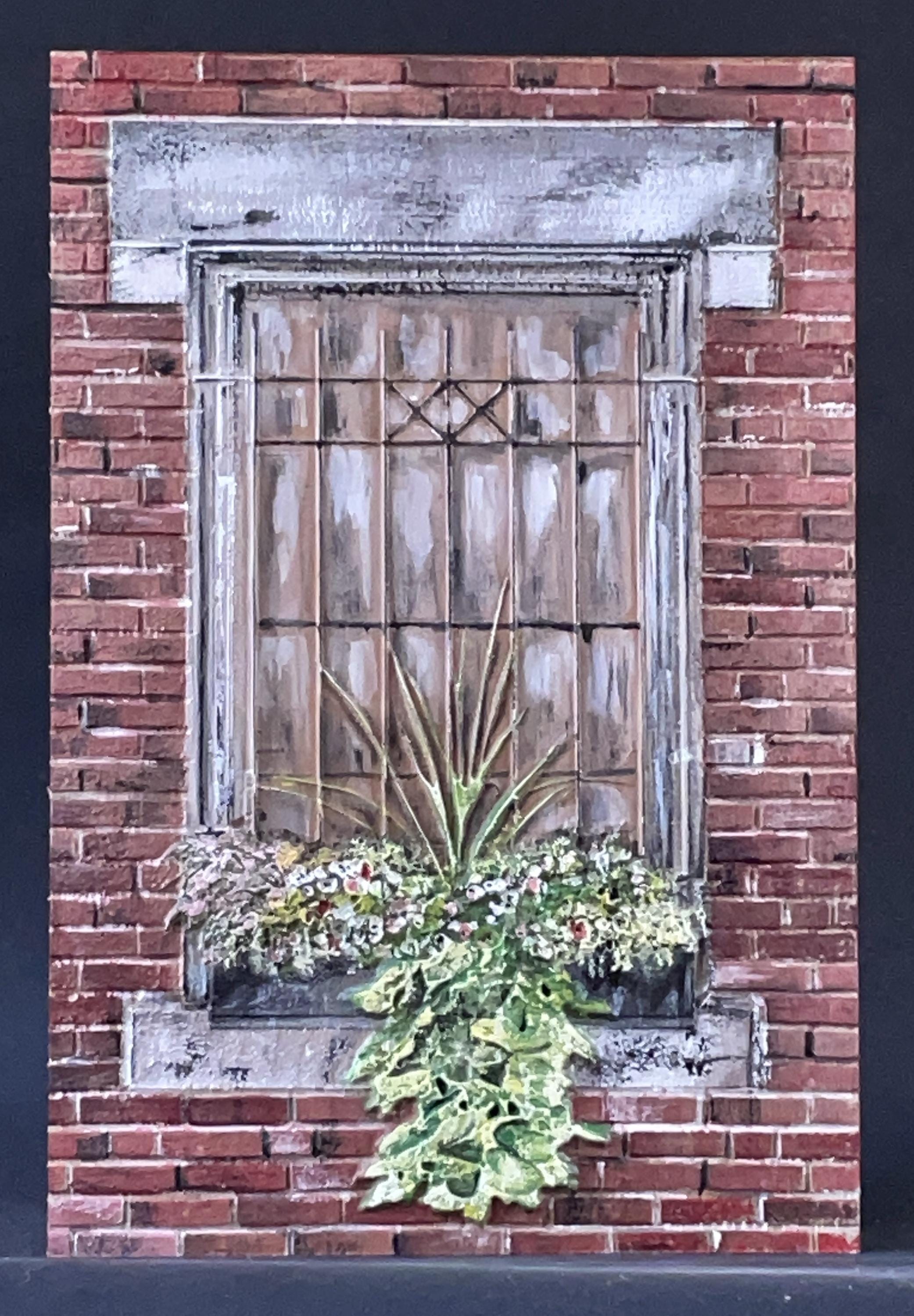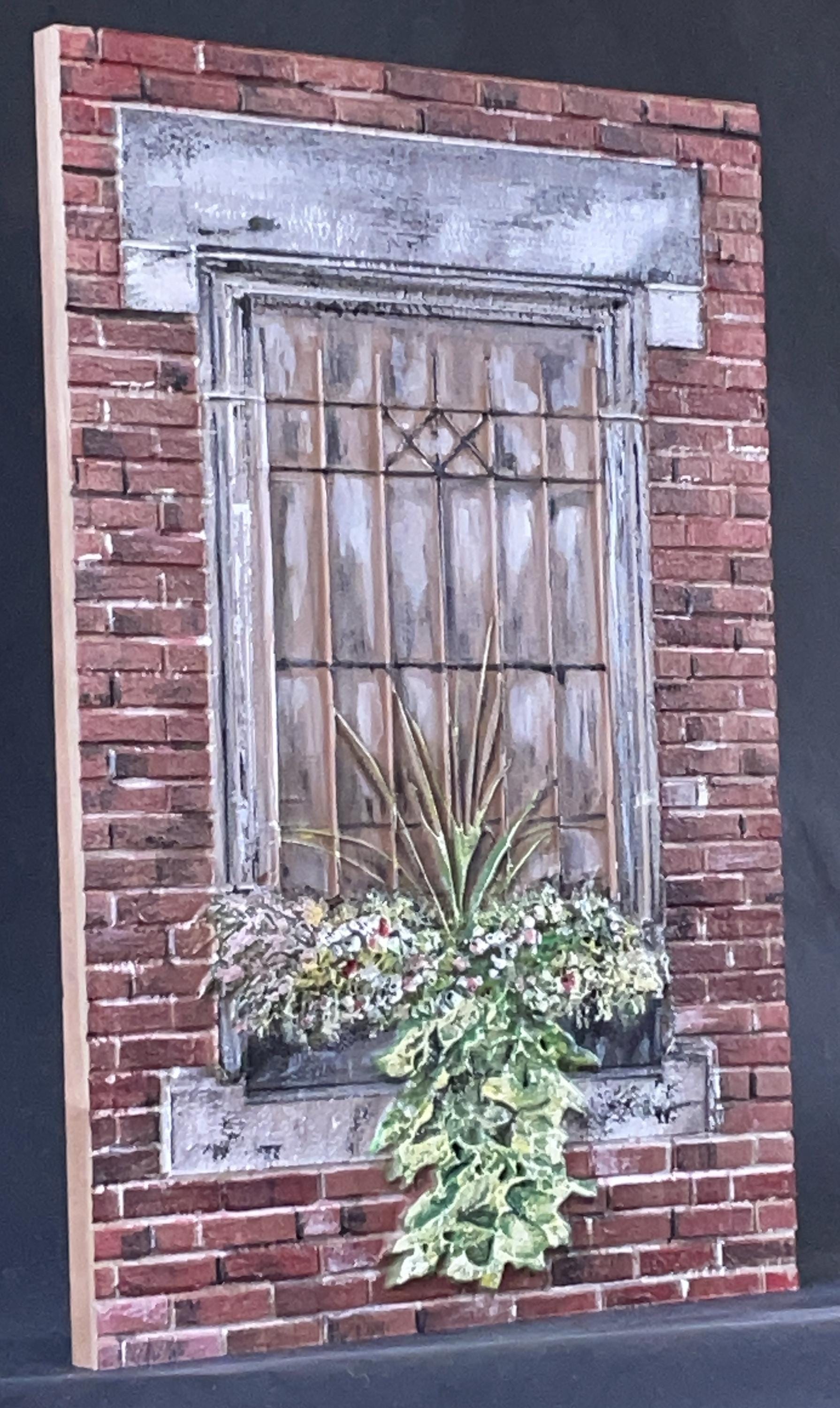 Architectural Charm gives you a vintage look at old school brick facade and a window. Flowers flowing out of a window box. This was caved in cherry wood and hand painted. Given a wood finish for protection. Ready to hang.