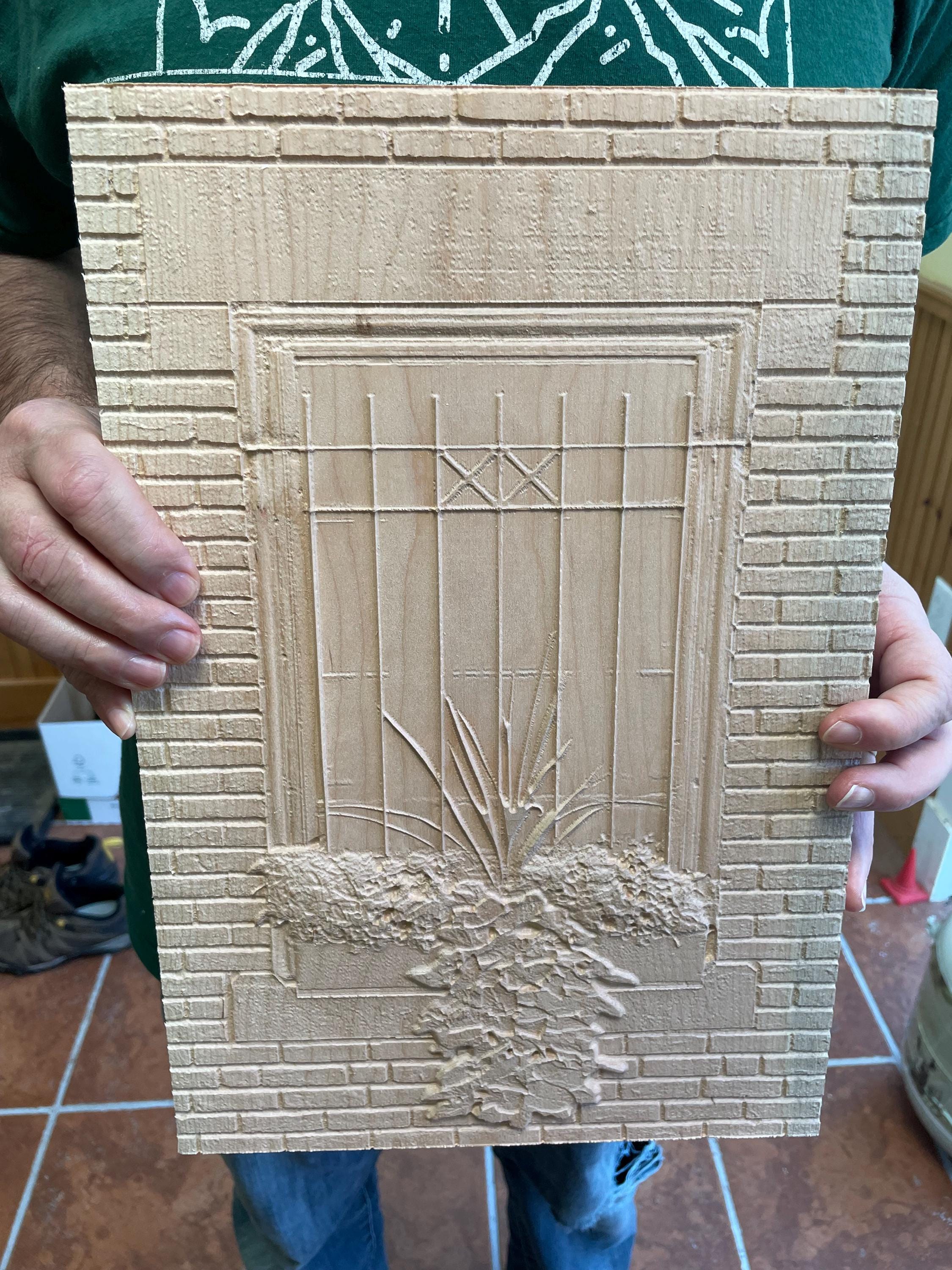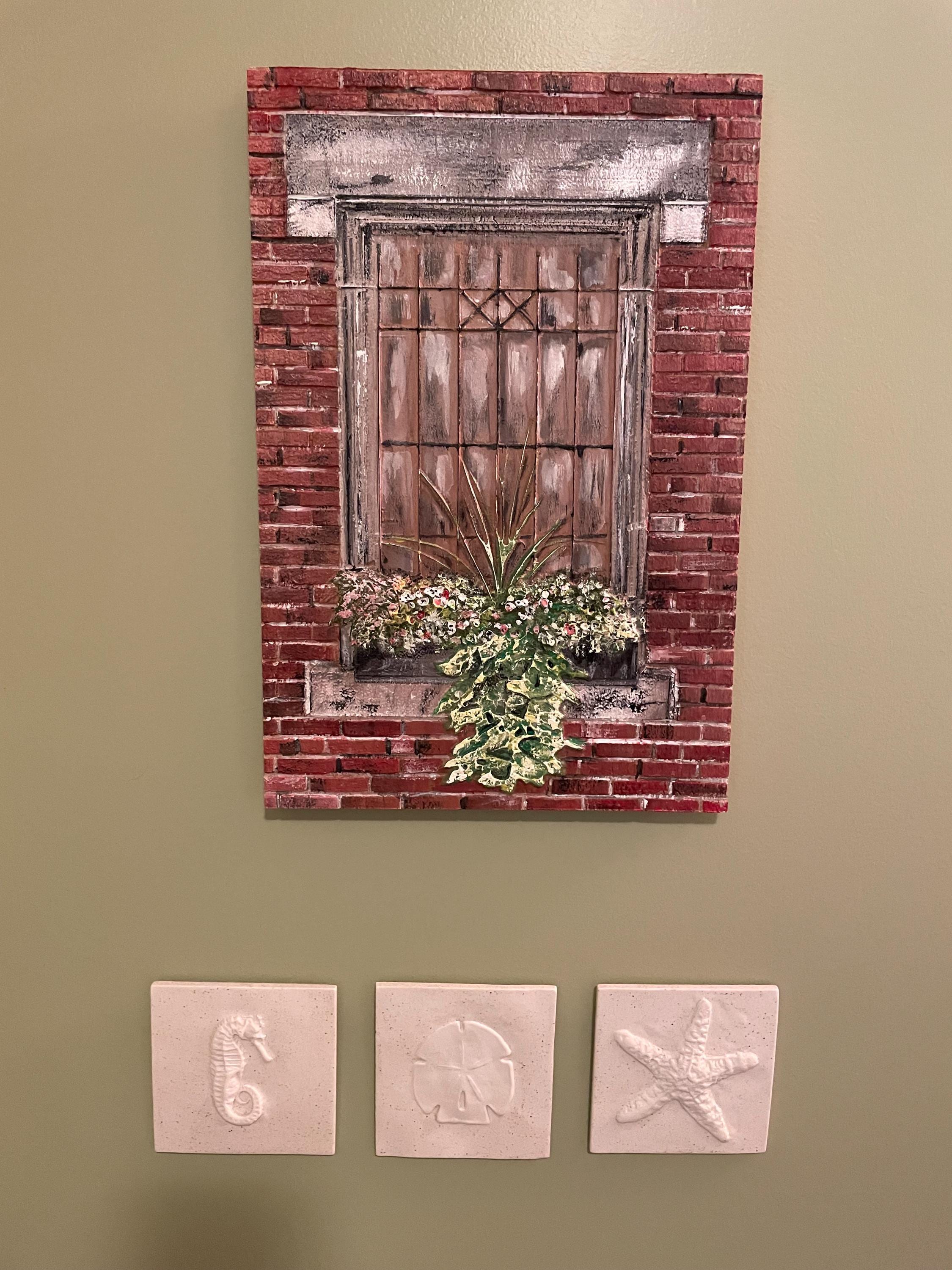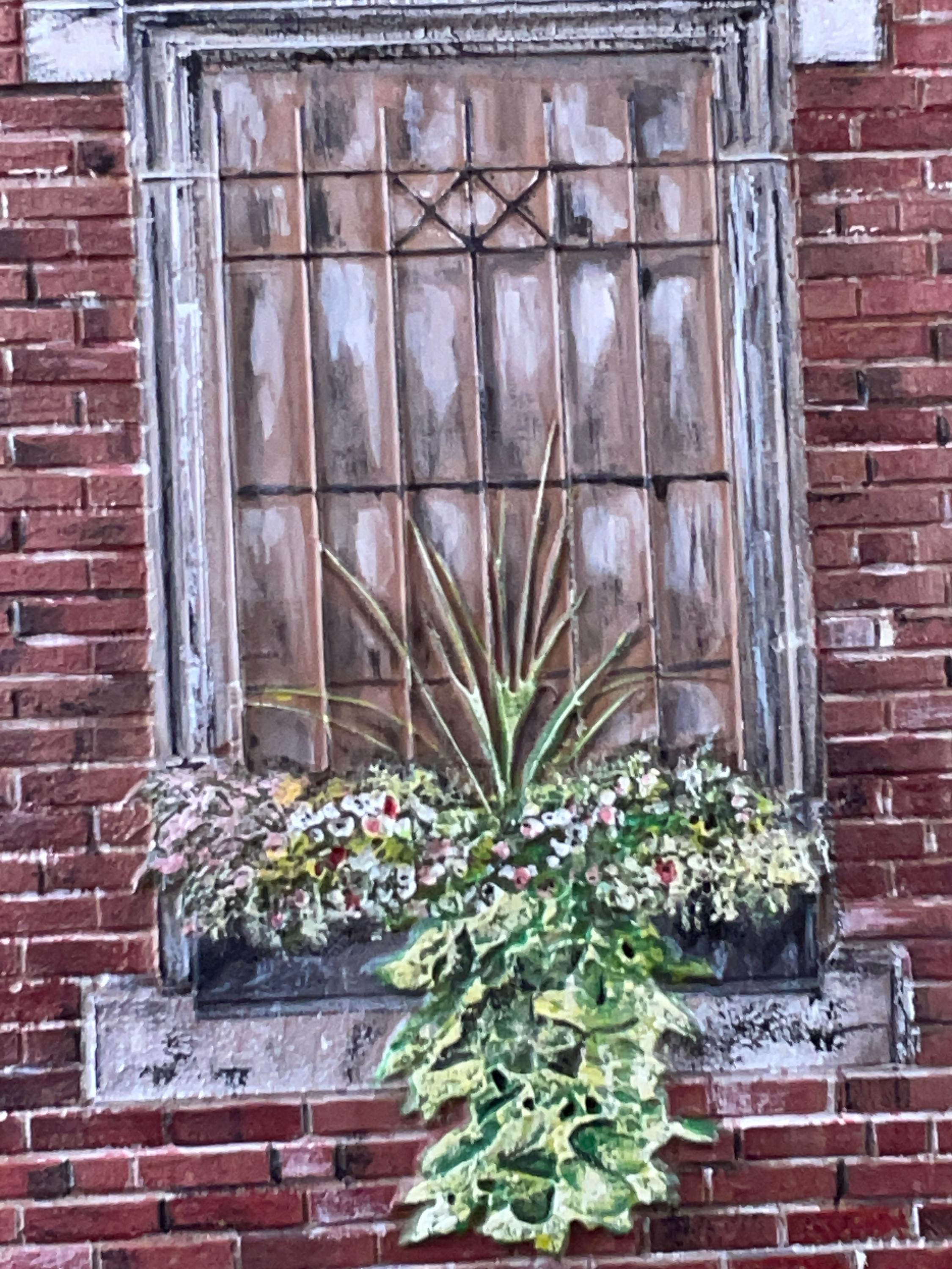 Architectural Charm gives you a vintage look at old school brick facade and a window. Flowers flowing out of a window box. This was caved in cherry wood and hand painted. Given a wood finish for protection. Ready to hang.