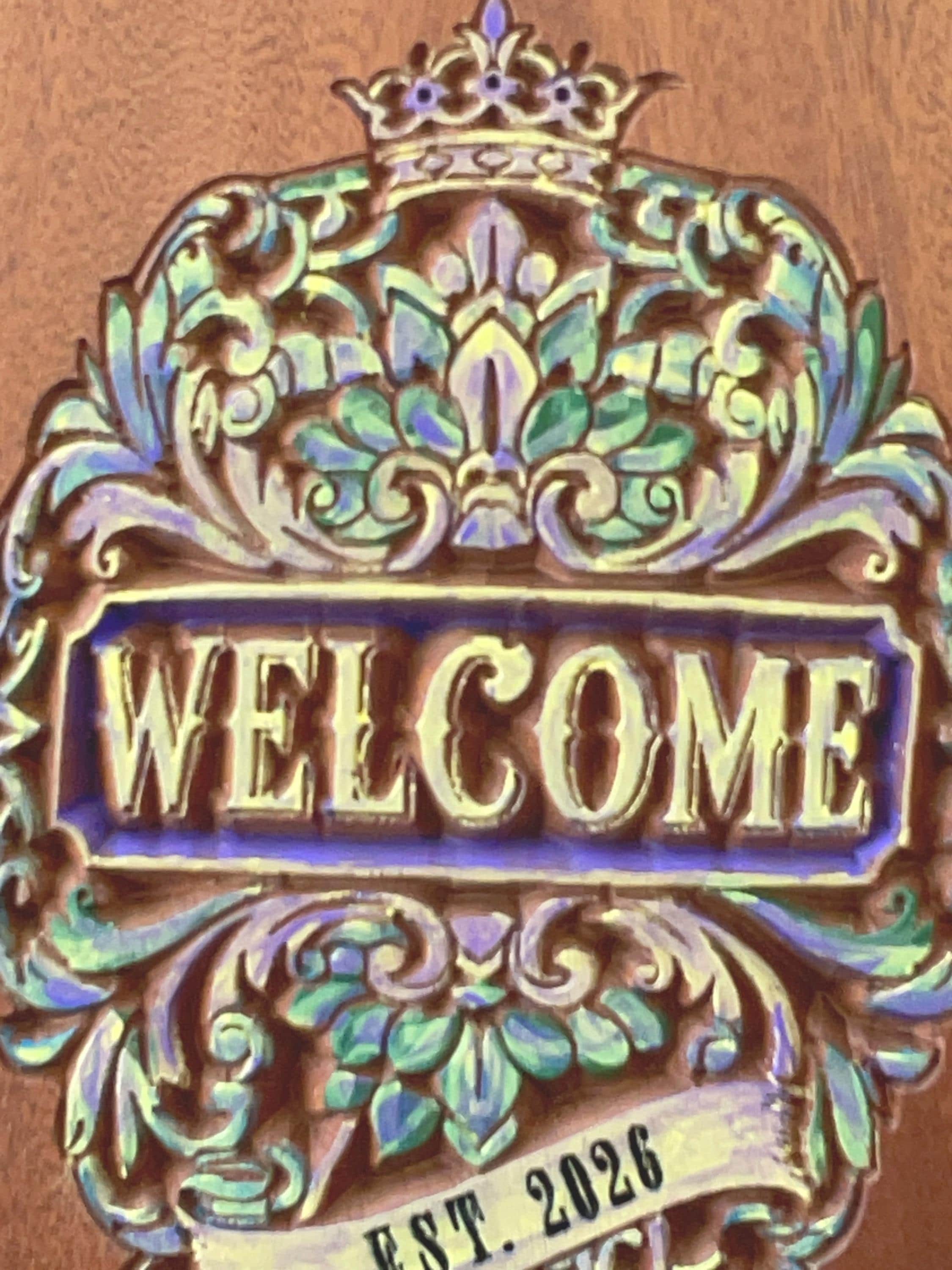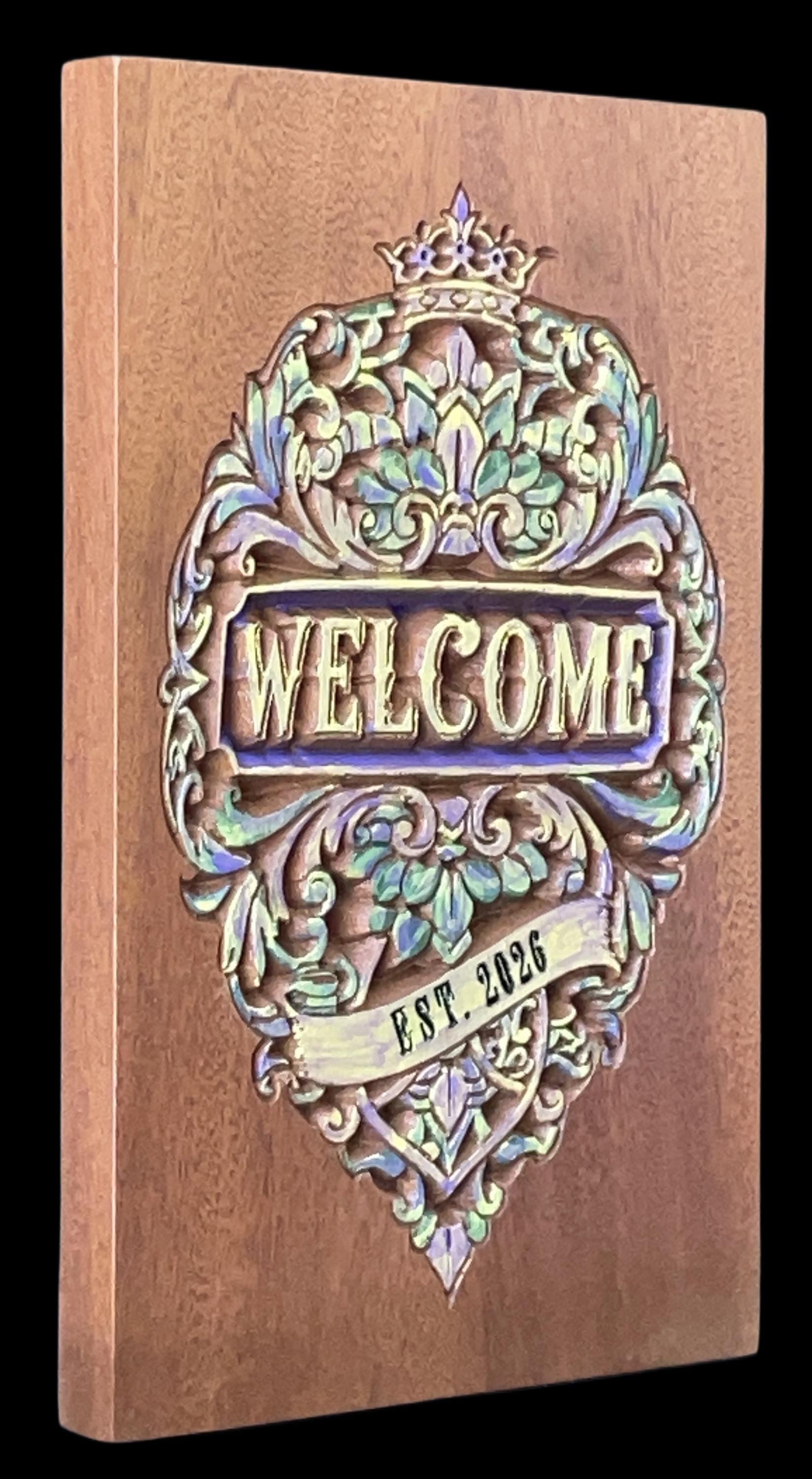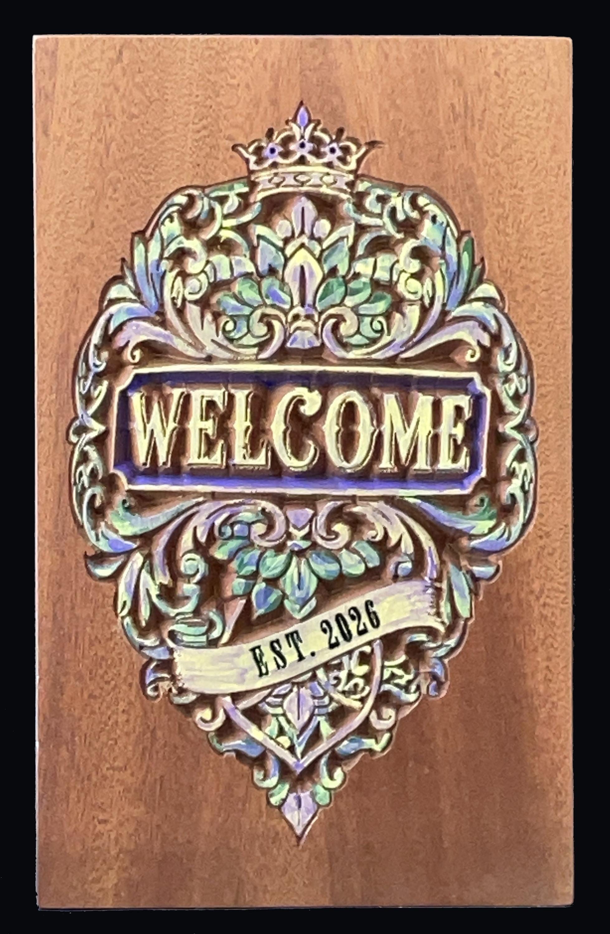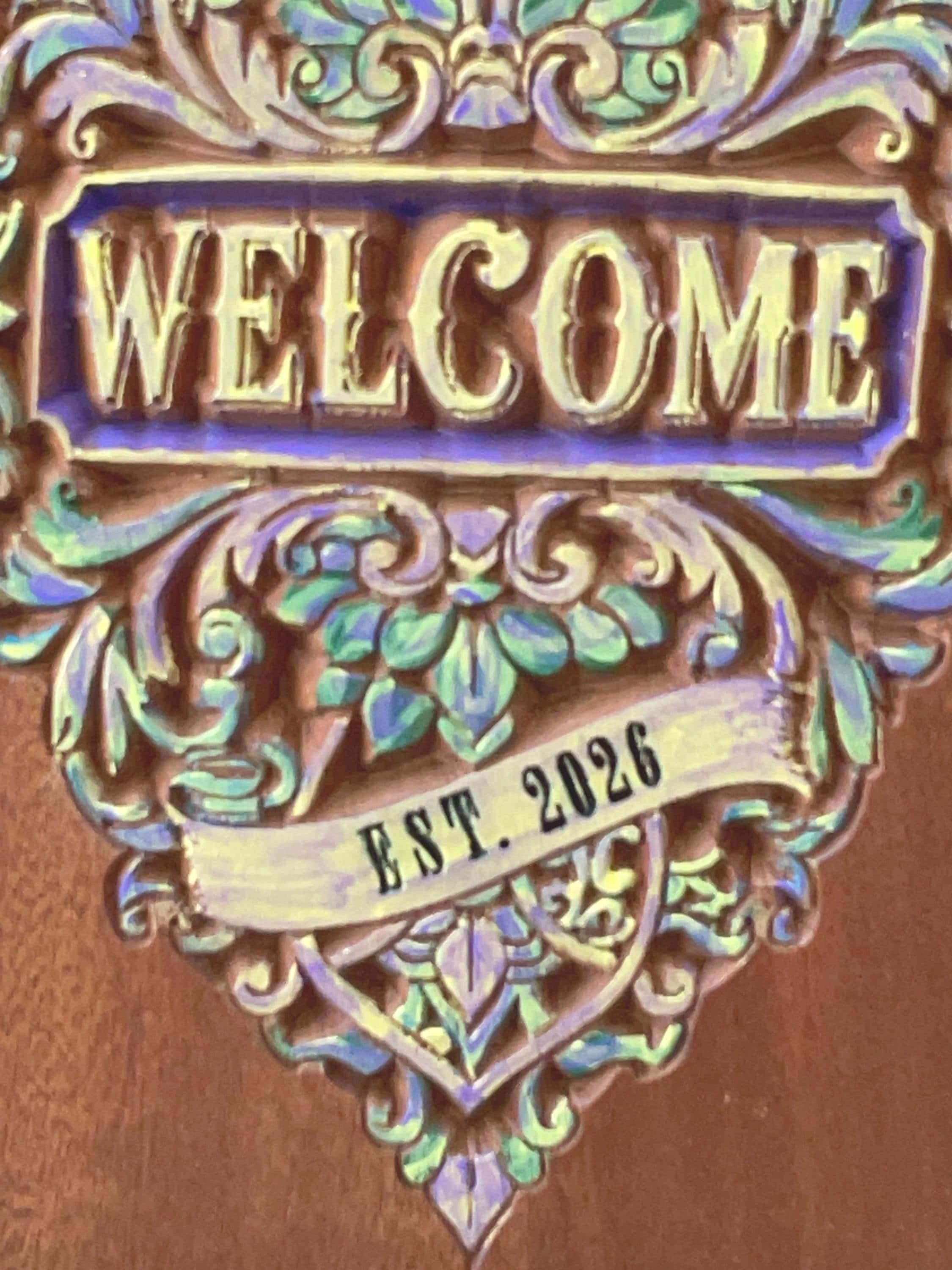 Welcome Sign carved in solid sapele wood. Sapele resembles the look and characteristics of mahogany with its rich grain. Hand painted with an EST. 2026. Great gift for first time homeowners in 2026. Wood finish applied. Ready to Hang.