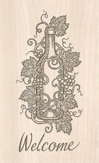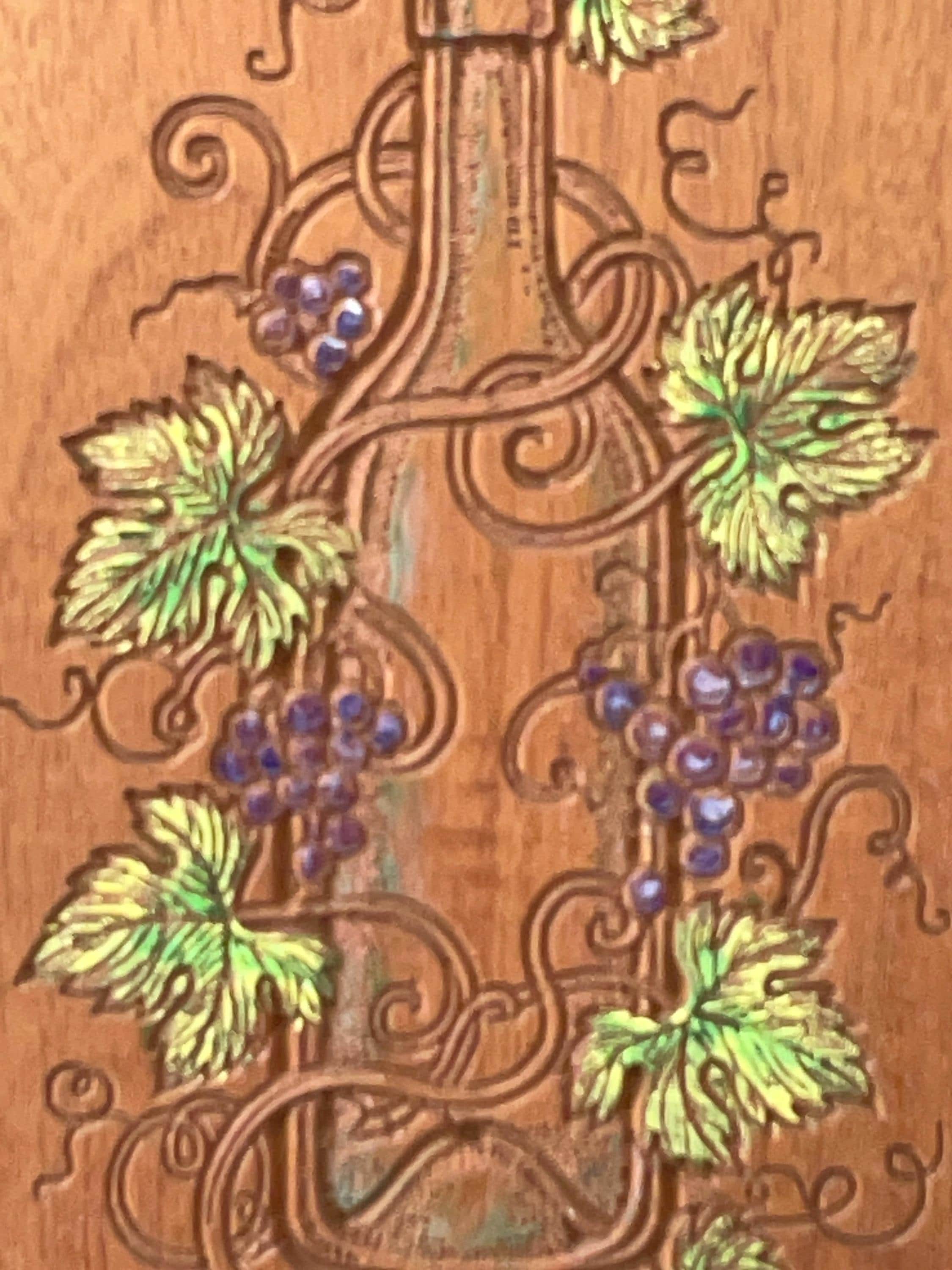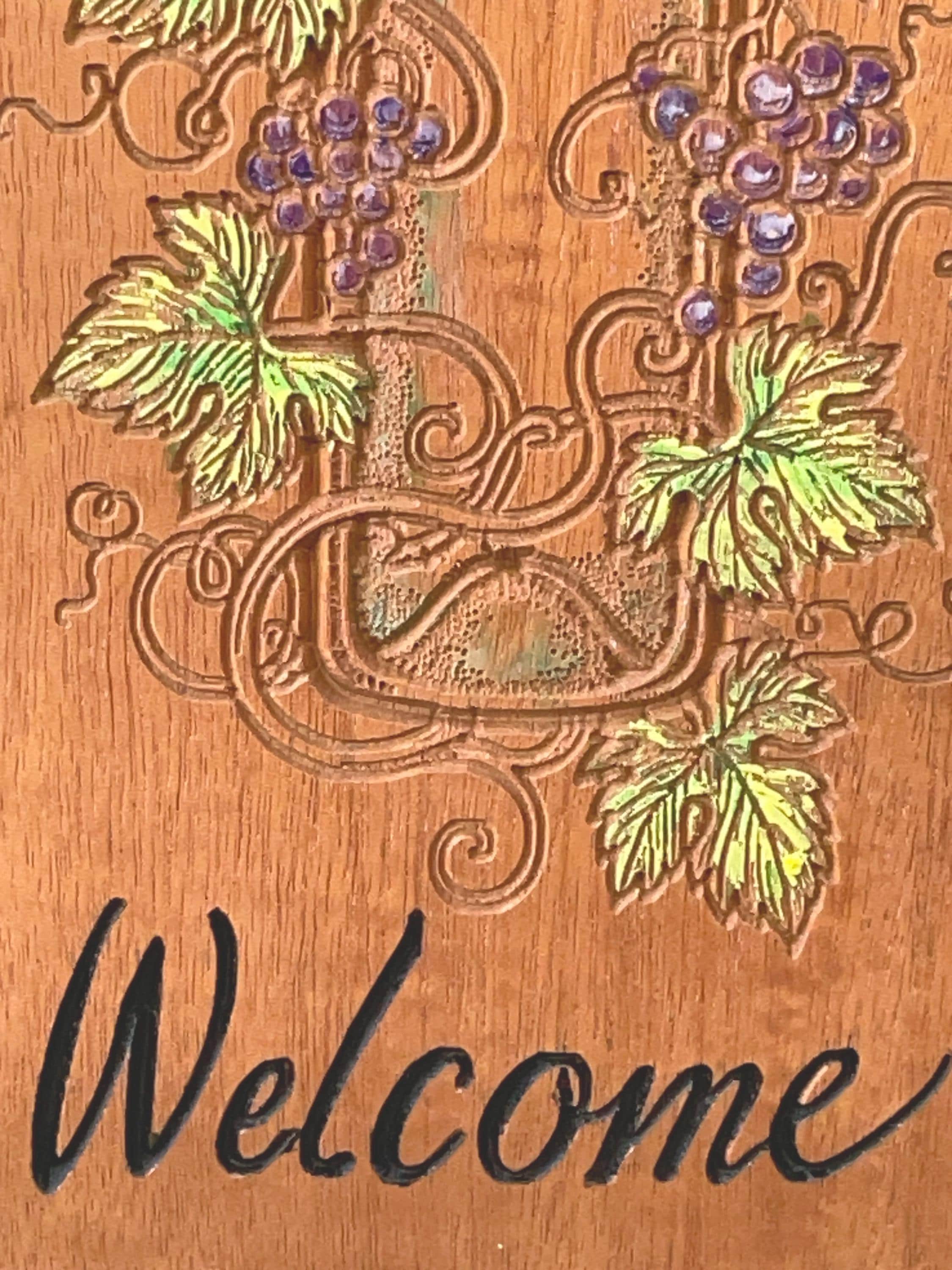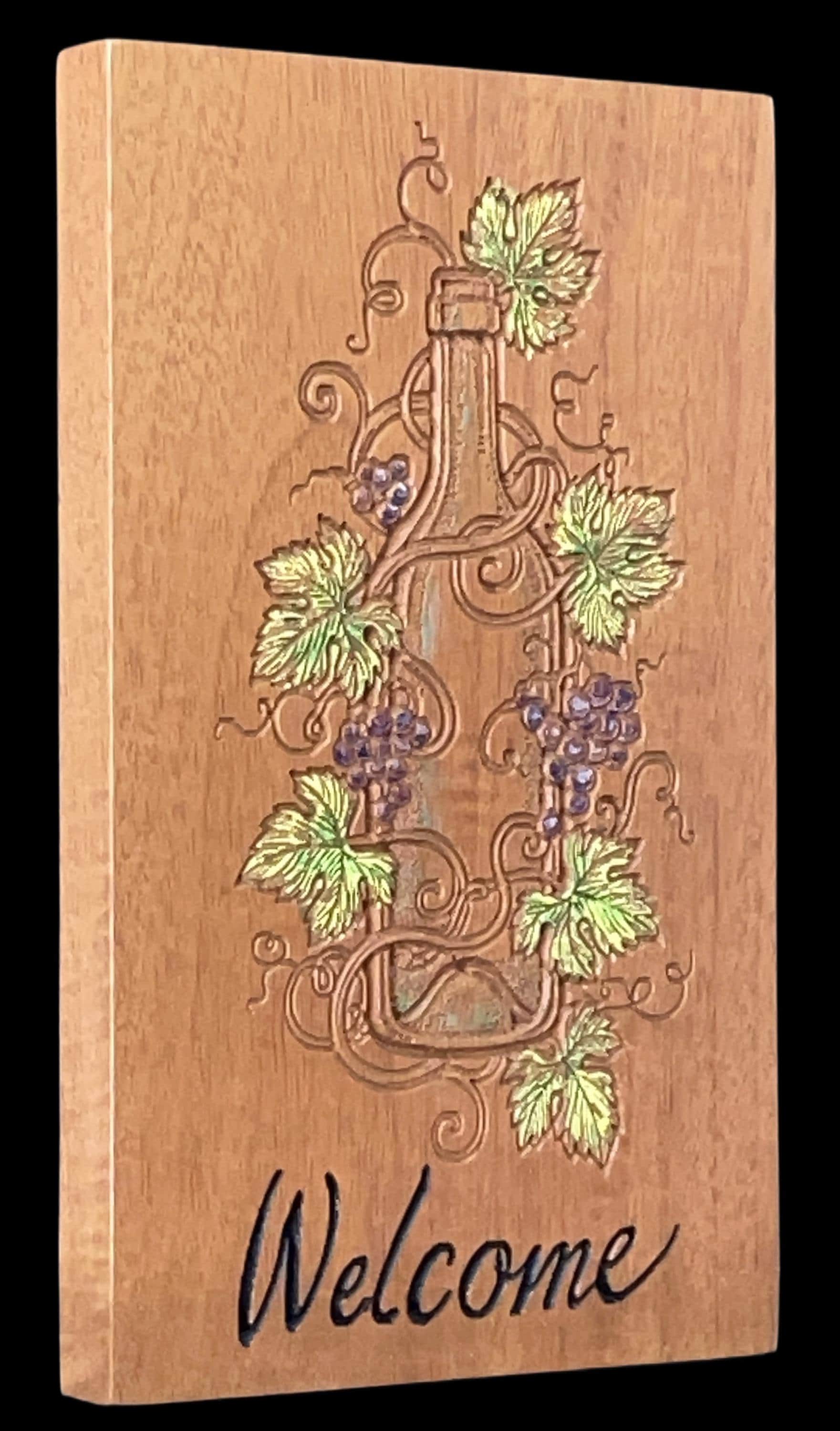 Custom wood carved sign with a wine theme. Subtly painted grapes, leaves and vines around a wine bottle. Custom text below. Carved in sapele wood (mahogany). Wood finish applied. Ready to hang.