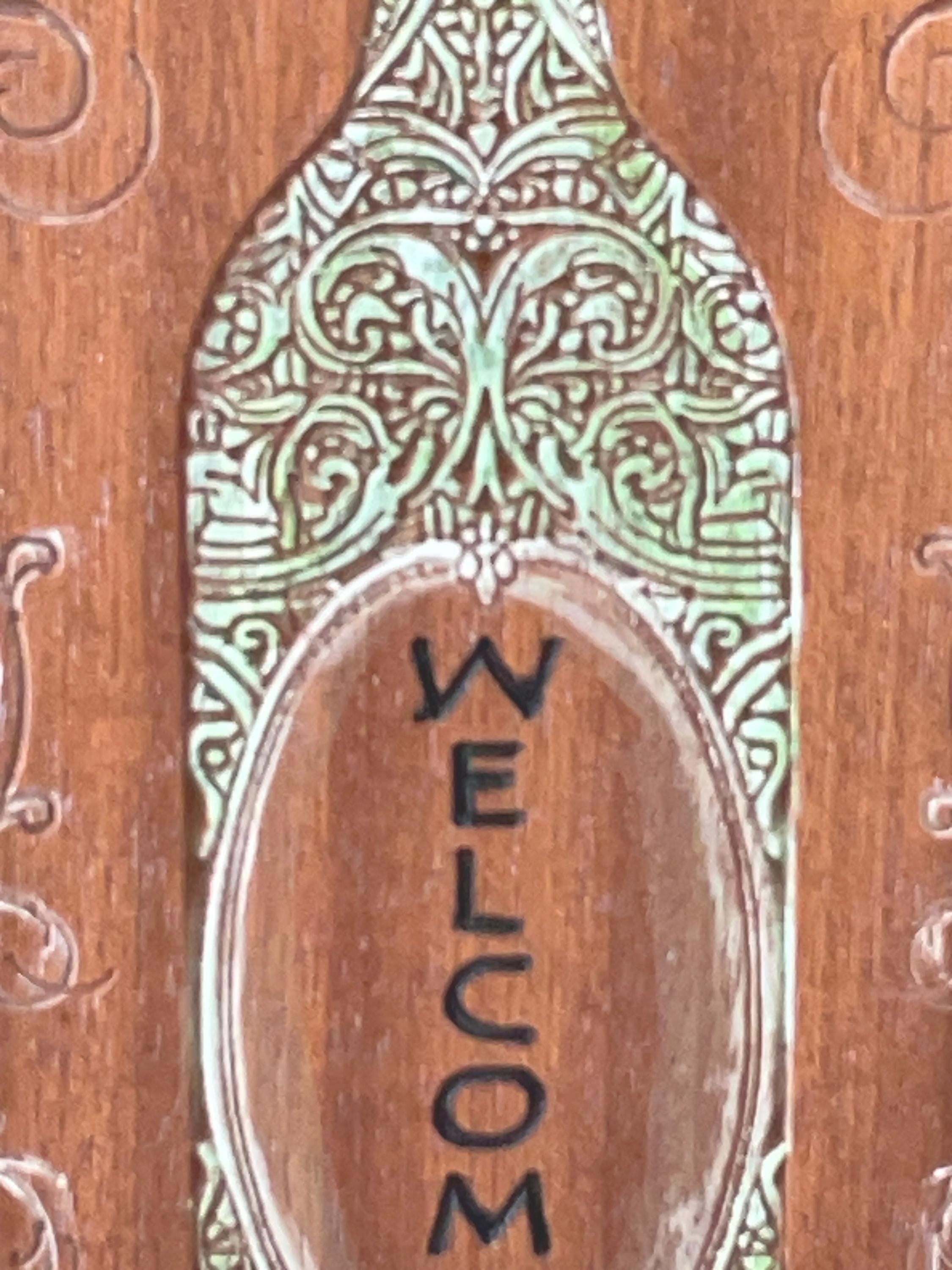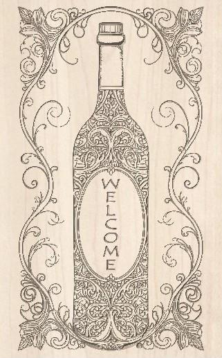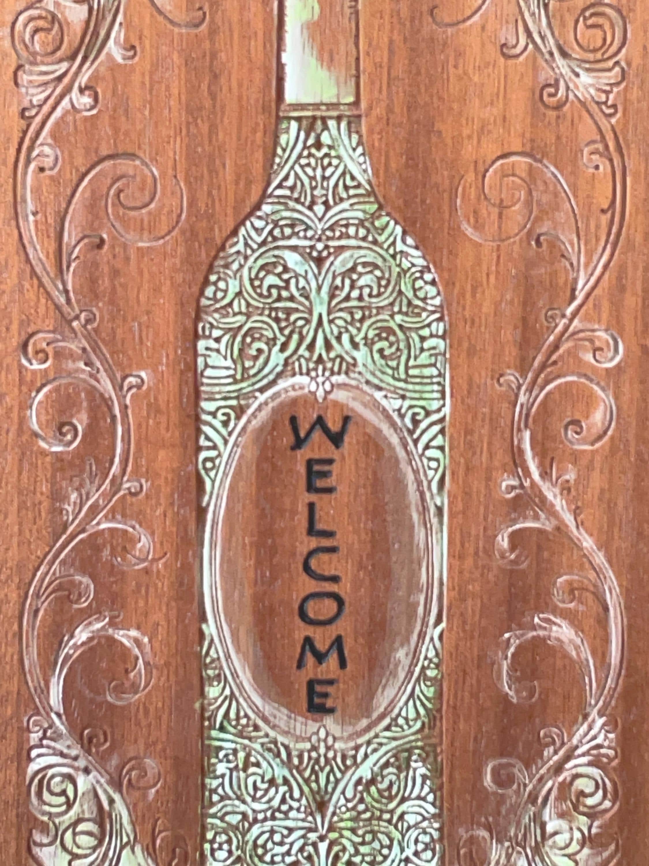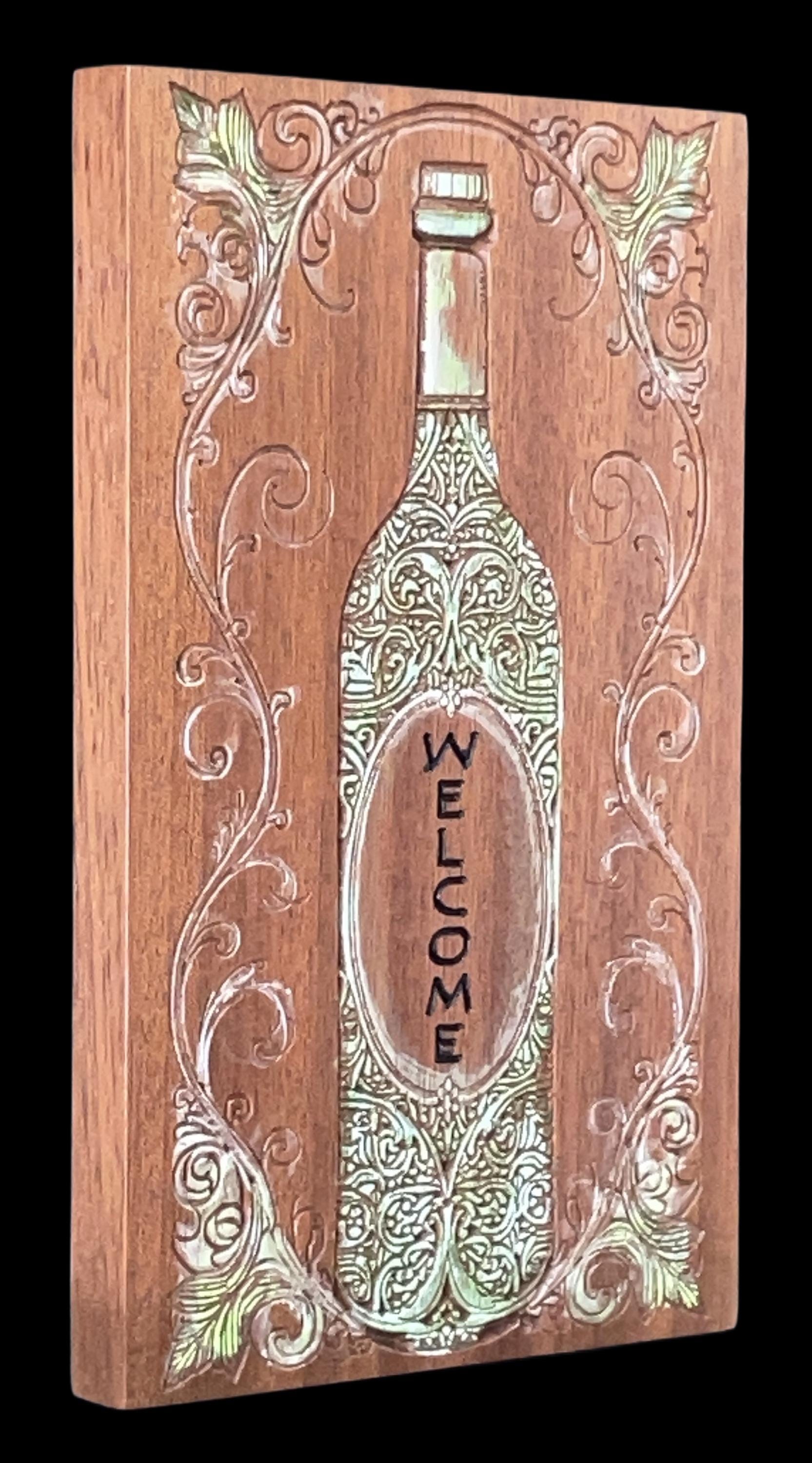 Custom wood carved sign. Wine bottle theme. Custom text on the label of the wine bottle. Ornate scrollwork surrounding the wine bottle. Subtly hand painted. Carved in sapele wood (mahogany). Wood finish applied. Ready to hang.