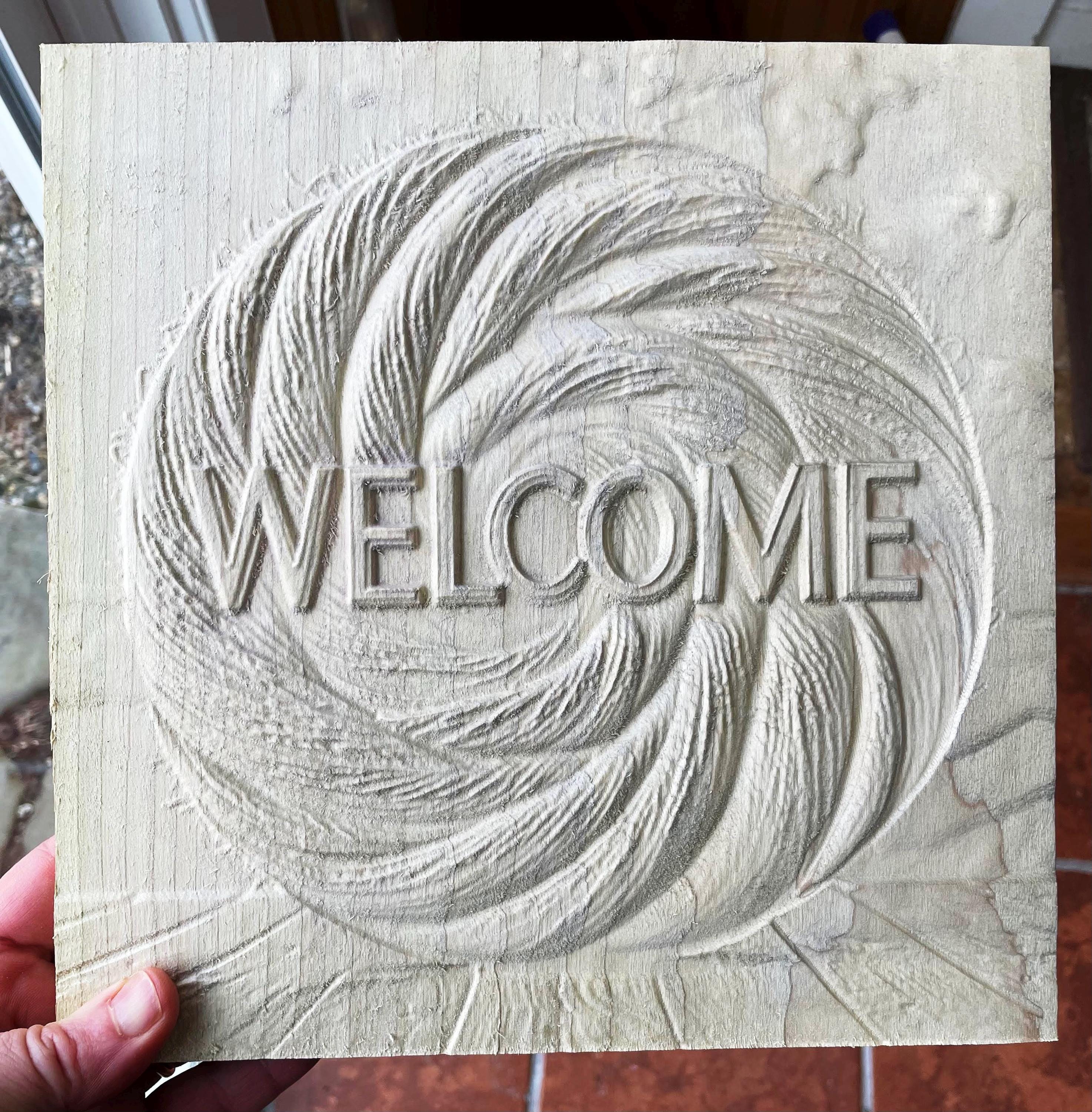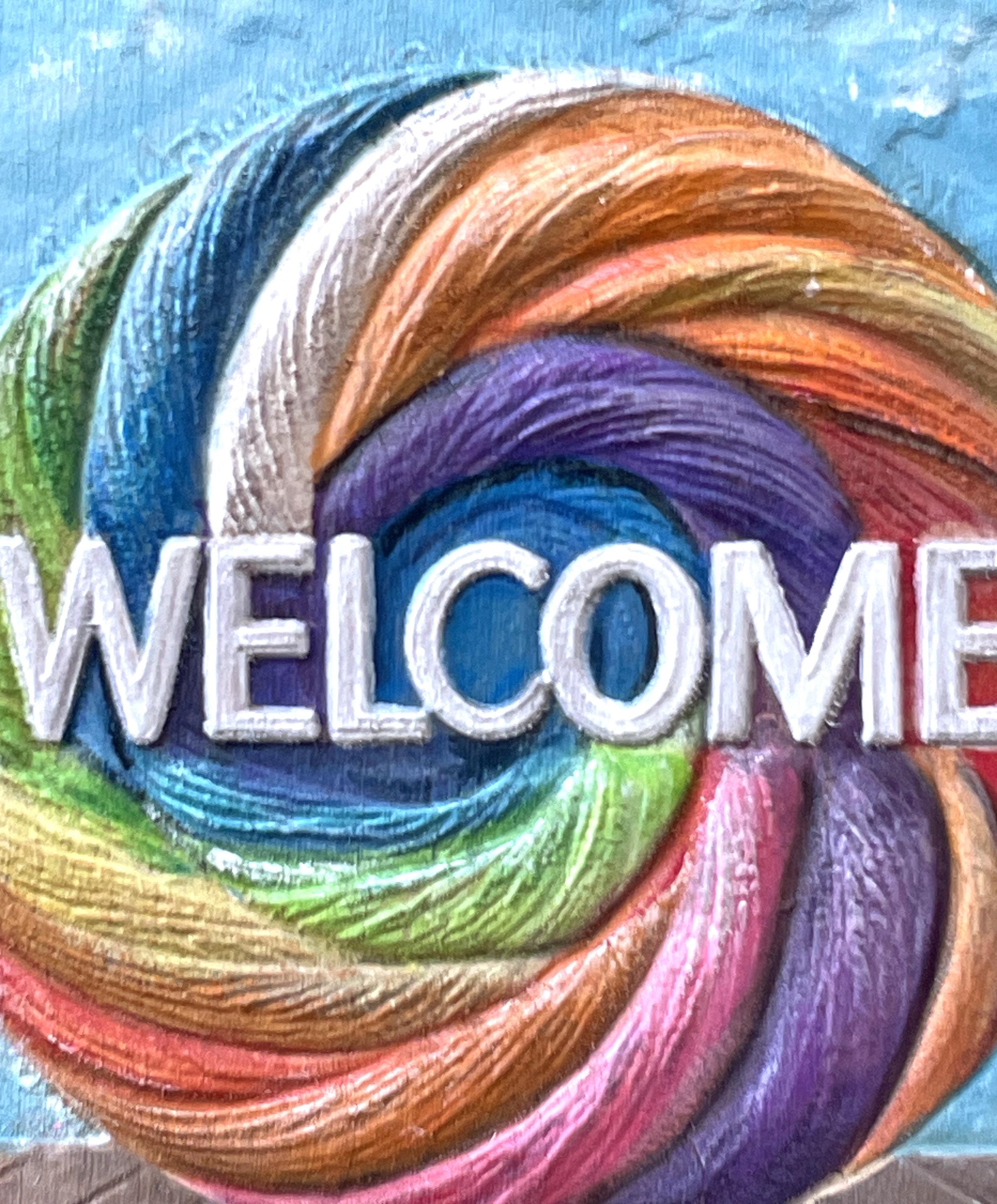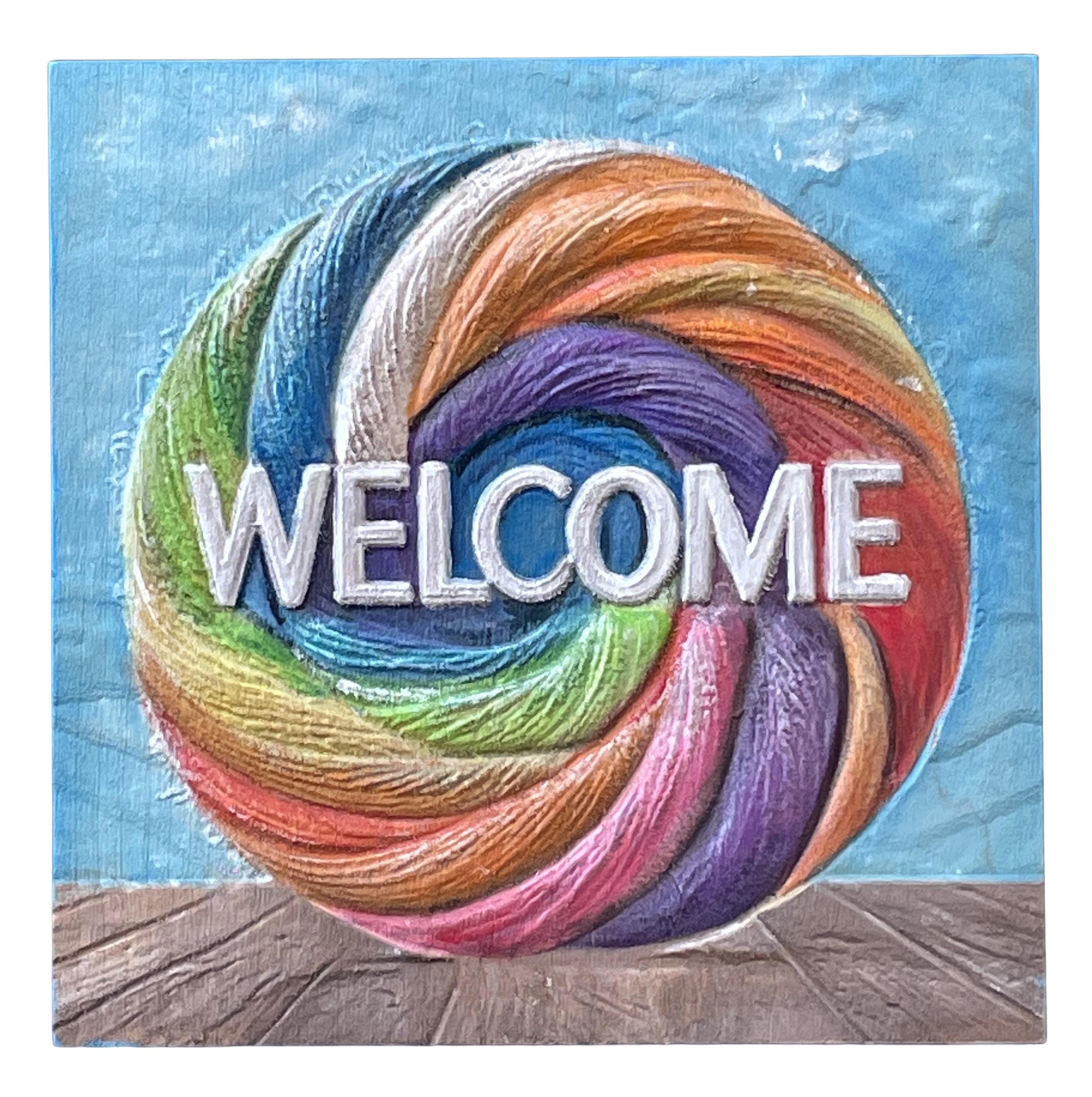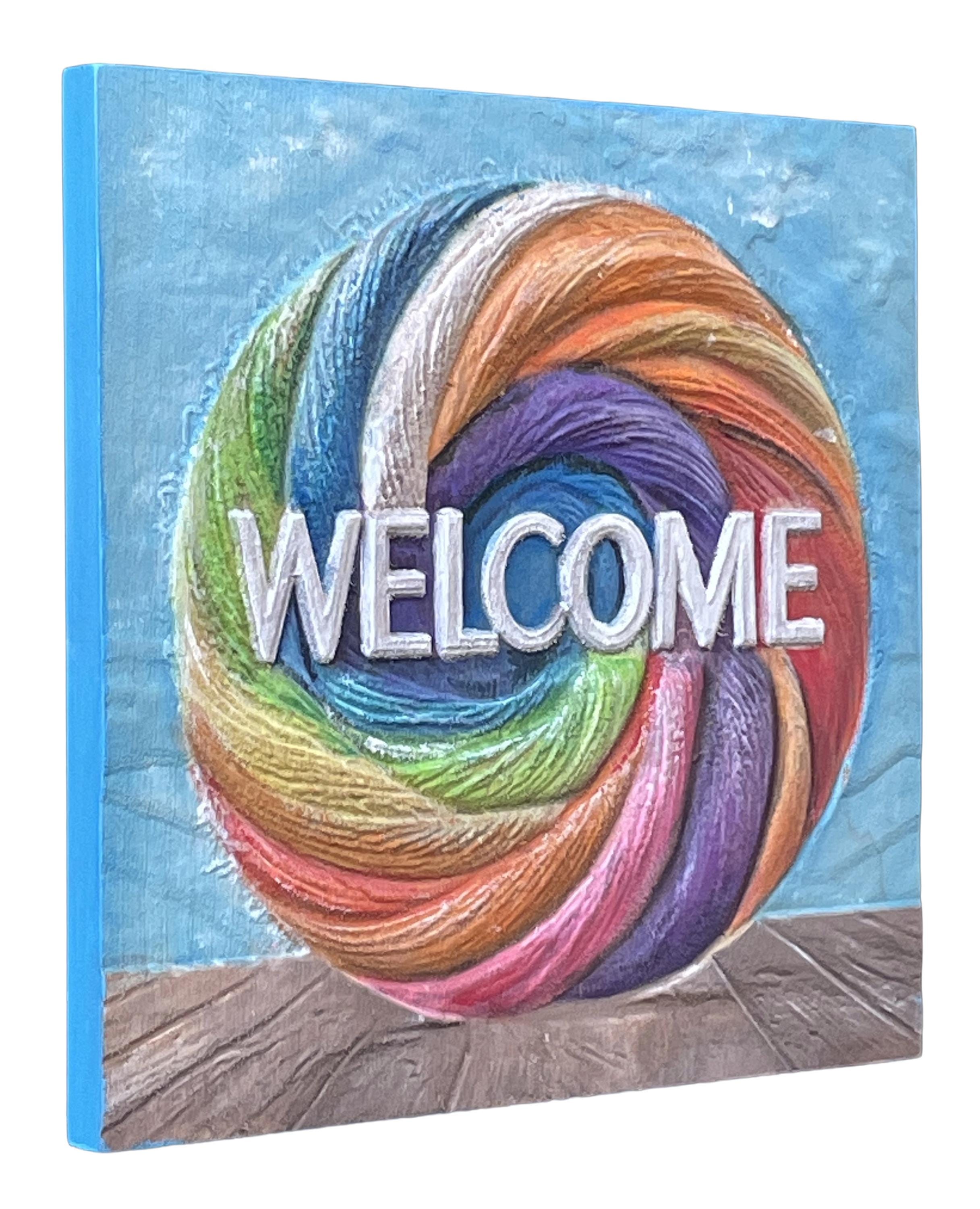 Carved in solid wood and hand painted. This rainbow yarn theme is a beautiful piece for a home. Bold colors along with a subtle blue sky in the background. Protective finish applied. Ready to hang. 10"x10"x5/8"